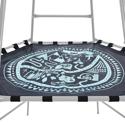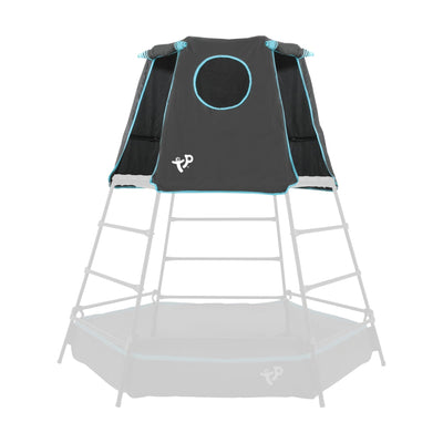 The TP Toys TP Explorer Black Replacement Den, featuring black and blue fabric with a circular window, is shown attached to the top of a transparent-outlined metal frame as a den replacement for the Explorer Climbing Frame. A close-up of the TP Toys TP Explorer Black Replacement Den, featuring blue trim, a circular mesh window, and a rolled-up entrance flap—ideal as a new den for your Explorer Climbing Frame.