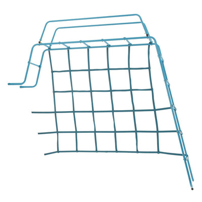 The TP Toys TP Explorer Replacement Den, shown in blue with yellow trim, features an open entrance and a round side window—perfect as a new den for your Explorer climbing frame. Close-up of the TP Toys TP Explorer Replacement Den’s blue top, featuring a round mesh window and rolled-up yellow-edged flaps—perfect for updating your Explorer climbing frame.
