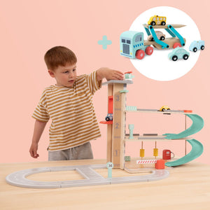 The TP Toys Owl & Fox Wooden Vehicle Transporter - FSC® certified features a sturdy wooden truck with a yellow car on top and three pastel-colored cars included. A young child plays on the floor with a TP Toys Owl & Fox Wooden Vehicle Transporter - FSC® certified and small cars in a brightly lit room, with shelves and baskets visible in the background.
