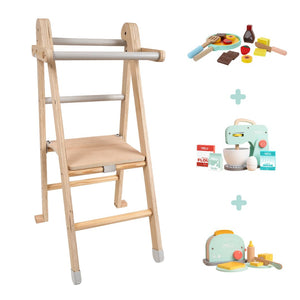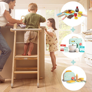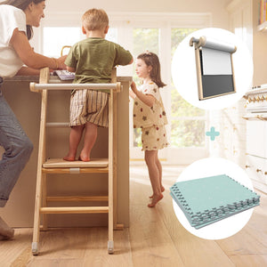 The TP Toys TP Active-Tots Pikler Style Wooden Folding Helper Tower With Play Easel & Play Mats (FSC® certified) features a seat and safety rail, shown open and folded—perfect for little ones to reach new heights safely. In a bright kitchen, an adult and two children interact. One child stands at the counter on the TP Toys Active-Tots Pikler Style Wooden Folding Helper Tower With Play Easel & Play Mats (FSC® certified), while the other holds a cup nearby.