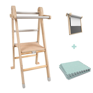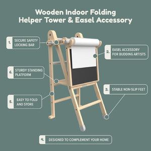 The TP Toys TP Active-Tots Pikler Style Wooden Folding Helper Tower With Play Easel features a chalkboard, paper roll holder, light gray plastic feet and connectors, plus an easel accessory to inspire creativity. FSC® certified. The TP Toys TP Active-Tots Pikler Style Wooden Folding Helper Tower With Play Easel is FSC® certified and features a lock bar, non-slip feet, sturdy platform, easy folding, and a neutral finish—ideal for safe, hands-on learning.