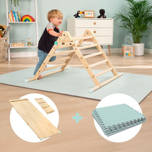 The TP Toys TP Active-Tots Pikler Style Wooden Climbing Triangle & Slide, FSC® certified, is a Montessori-inspired indoor play set for kids’ motor skill development, shown on a white background. The TP Toys Active-Tots Pikler Style Wooden Climbing Triangle & Slide - FSC® certified offers fun and secure play, climb and slide features, easy folding and storage, plus supports motor skill and problem-solving development.