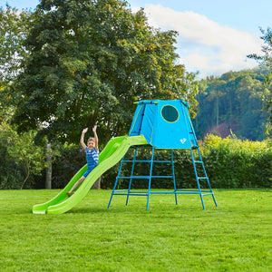 The TP Toys TP Explorer Metal Climbing Frame Set & Ripple Slide features a blue and green tented top, ladder steps, and a wavy slide—ideal for pairing with an adventure playmat to spark endless outdoor fun. Three children play on the TP Toys TP Explorer Metal Climbing Frame Set & Ripple Slide with a blue tent in a grassy backyard surrounded by trees and flowers.
