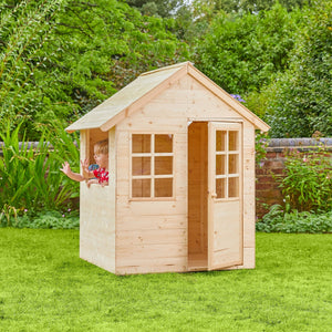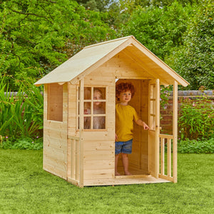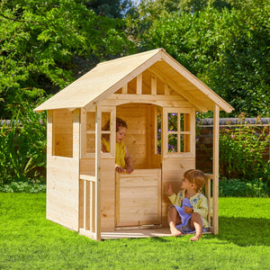 The TP Toys TP Forest Cabin Wooden Playhouse is FSC® certified and made of unfinished light wood, featuring a front porch, door, and window—perfect for the garden. Two young children play outside in the TP Toys TP Forest Cabin Wooden Playhouse, which is FSC® certified, on a grassy lawn under a blue sky.