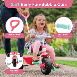 The TP Toys Scuttlebug Bumble Foldable Ride On Trike features a yellow and black three-wheel design, handlebar, smiling face, and bee-like stripes on the seat. A young child in a blue shirt and denim shorts stands with one leg over the TP Toys Scuttlebug Bumble Foldable Ride On Trike, highlighting its unique three-wheel design.