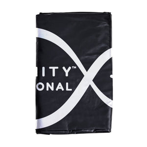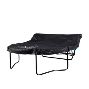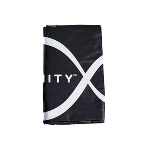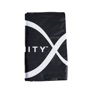 The TP Toys 10x14ft Infinity Rectangular Premium Cover is a folded black trampoline cover with a large white infinity symbol and partial ITY™ text, designed for 10x14ft TP rectangular trampolines and featuring drainage holes. The TP Toys 10x14ft Infinity Rectangular Premium Cover is a black foldable mat cover with drainage holes and a white infinity logo, designed specifically for TP 10ft x 14ft rectangular trampolines.