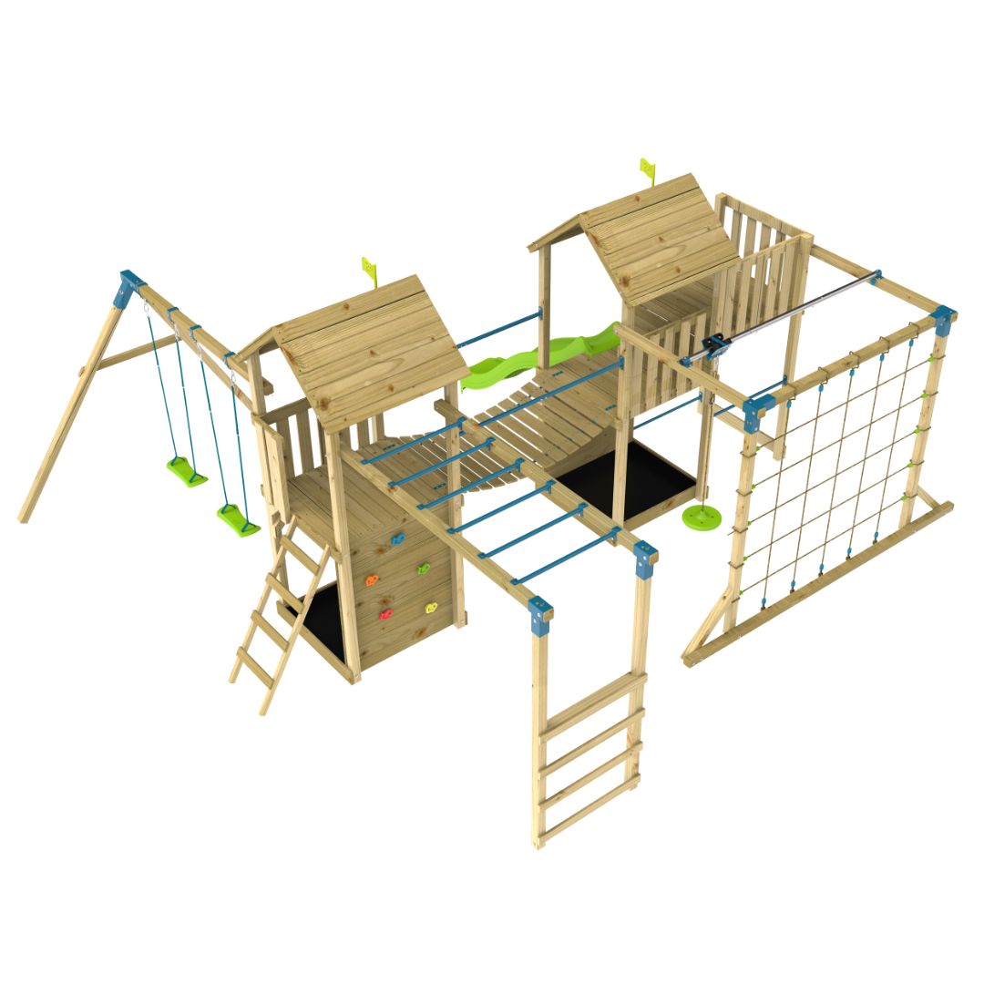 TP Skywood Wooden Climbing Frame with Extra Play Tower, Sky Deck, Skyline with Flying Fox, Monkey Bars, Double Swing Arm & Slide - FSC® certified