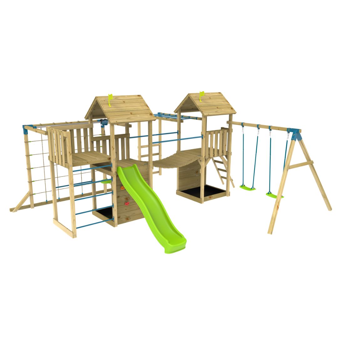 - More ways to play! Comes with our best selling 8ft Ripple slide, our amazing Skyline with flying fox zipline, the fun, challenging Monkey Bars, a double swing arm & an additional play tower!