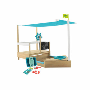 The TP Toys Ahoy Wooden Playboat - FSC® certified features a blue canopy, steering wheel, chalkboard, sand and water play areas, and a green flag—perfect for imaginative outdoor adventures. Two young children play on the TP Toys Ahoy Wooden Playboat – FSC® certified, a ship-shaped sandbox with a blue canopy and “Ship Ahoy!” chalkboard, set on a grassy lawn with plants in the background.