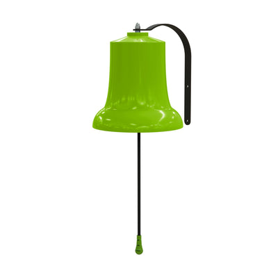 The TP Toys TP Bell Cottage Playhouse Accessory is a green metal waterproof bell with a black bracket and pull cord, hanging vertically against a white background—ideal for easy outdoor playhouse fun. The TP Toys TP Bell Cottage Playhouse Accessory is a bright green, waterproof bell with a black cord, easily attached to a wooden playhouse exterior—an ideal accessory for imaginative play.