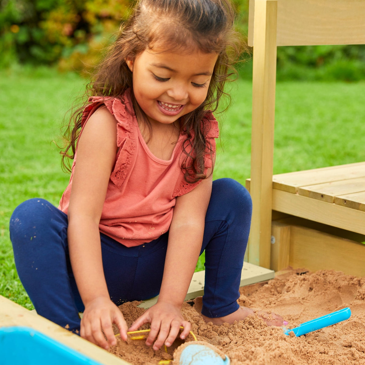 - Includes sandpit, wheel, blackboard, splash bowl, sail and storage
