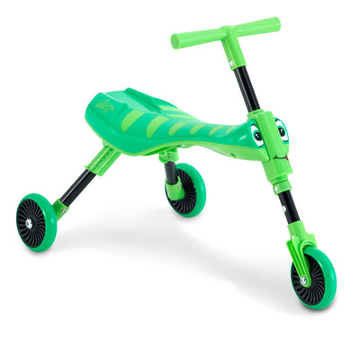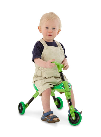 The TP Toys Scuttlebug Grasshopper is a green, foldable three-wheeled ride-on trike for toddlers, featuring black handles and a smiling face on the front for a playful look. A young child with blond hair sits on a TP Toys Scuttlebug Grasshopper Foldable Ride On Trike, wearing a dark shirt, beige overalls, and blue sandals against a white background.