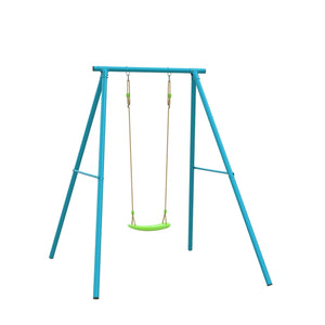 The TP Deluxe Single Metal Swing Set by TP Toys features a compact blue metal frame and an adjustable green swing seat, hanging securely from two sturdy blue ropes. A young girl in a blue dress swings on the TP Toys TP Deluxe Single Metal Swing Set with an adjustable seat, surrounded by green grass and blooming flowers.