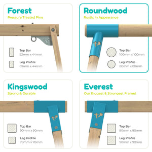 The TP Toys Sherwood Wooden Double Swing Set features a rustic blue and wood frame with a small flag, including a flat green roped Rapide seat and a green baby seat. Close-up of a blue metal joint with bolts connecting three wooden poles in the TP Toys Sherwood Wooden Double Swing Set with Roped Rapide Seat & Baby Seat; trees and sky visible in the background.