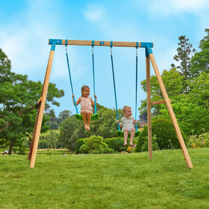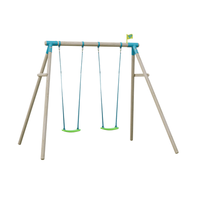 The TP Forest Wooden Double Swing by TP Toys features two green Rapide Swing Seats with blue ropes and a small green flag, all crafted from FSC®-certified pine for premium quality. Two young children are playing on a TP Toys TP Forest Wooden Double Swing—FSC® certified, in a grassy backyard surrounded by trees and bushes under a partly cloudy sky.