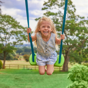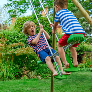 The TP Toys TP Deluxe Single Metal Swing Set features a powder-coated steel frame and an adjustable green Rapide seat with ropes, designed for durability and fun. The Build Your Own Deluxe Double Metal Swing Frame by TP Toys features a sturdy 45mm thick pole—much thicker than the 28mm pole of average competitor swing sets—for double the strength and compatibility with TP swing accessories.