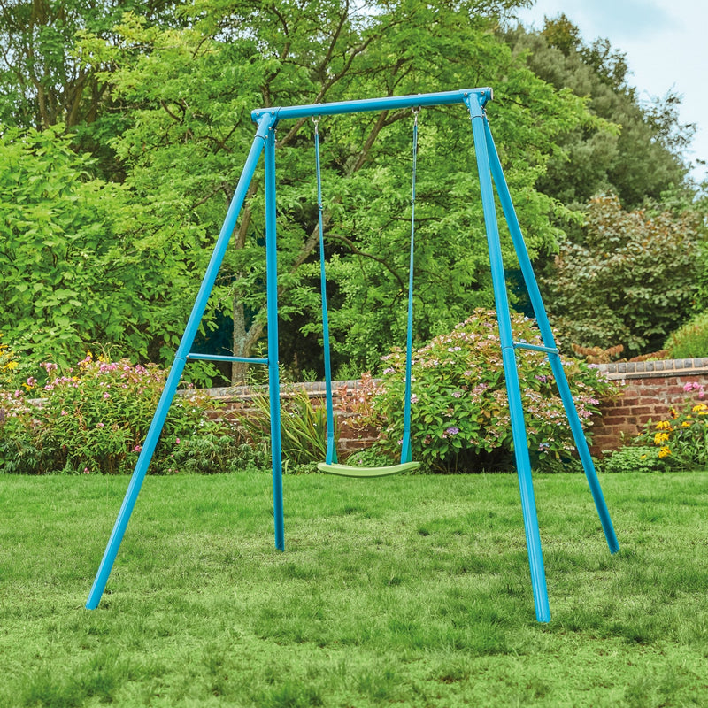 A robust, Single Swing Set in attractive blue and lime colourway. All in one box and easy to assemble.