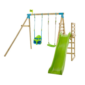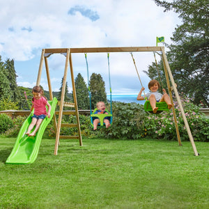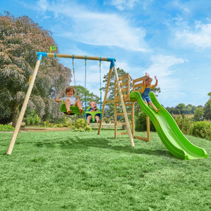 The TP Toys TP Knightswood Triple Wooden Swing & 8ft Slide Set includes a green wavy slide, two green swings, a rope ladder, and a climbing ladder for hours of outdoor fun. Kids enjoy the TP Toys TP Knightswood Triple Wooden Swing & 8ft Slide Set, swinging and racing down the slide while others wait their turn, all on a fun wooden play centre.