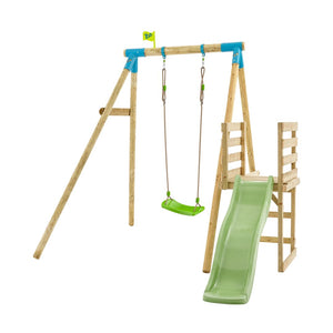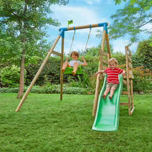 The TP Toys TP Robin Swing and 6ft Slide Set is a compact wooden playframe with a blue swing, 6ft wavy green slide, and platform with wooden railings—perfect for outdoor garden fun. Two children play in the backyard on the TP Toys TP Robin Swing and 6ft Slide Set; a girl uses the swing while a boy goes down the wavy slide, surrounded by trees and grass—ideal for outdoor fun.