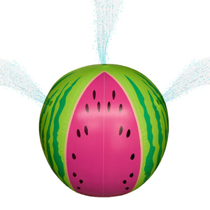 The TP Toys Hydro Watermelon Sprinkler is a large inflatable ball shaped like a watermelon that sprays water from the sides, making it a fun outdoor garden sprinkler and summer water toy. The TP Toys Hydro Watermelon Sprinkler is a large, playful outdoor toy that sprays water from multiple holes, providing fun garden sprinkler action on your green lawn.