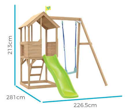 • More ways to play! Play Tower comes with our best selling wavy slide, a sturdy wooden swing arm with Bluey Quadpod swing seat & a built in area underneath the tower perfect for sand or play balls.