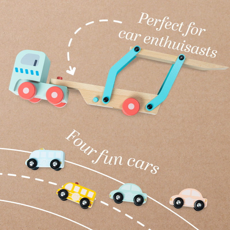 Rev up the fun with the Owl & Fox Vehicle Transporter, perfect for little car enthusiasts. Take care to load all four cars onto the truck to start the journey and shift into play mode. Inspiring imaginative play and allowing storytelling skills to flourish whilst supporting the development of their communication and social skills. Pairs perfectly with our Owl & Fox Wooden Two Storey Garage playset.