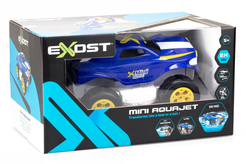 Introducing Exost Mini Aqua Jet, the super transforming amphibious vehicle! With two modes included; 4 x 4 mode and boat mode. Experience off-road with the Mini Aqua Jet’s 4x4 design and oversized tires to power over any terrain. Nothing can stop the Mini Aquajet, when in water, transform this vehicle into a boat. With the push of a button the Mini Aqua Jet’s wheels mechanically rotate, allowing you to activate the propellers and go! It’s water resistant body and indestructible exterior equal unlimited fun!