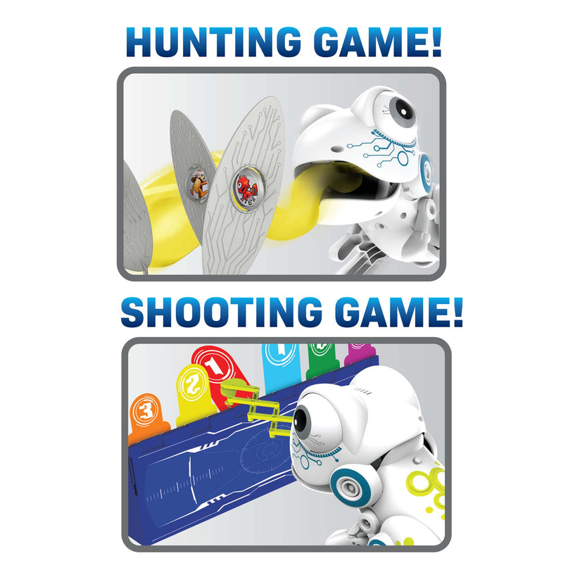Hop, aim and catch the Robo Frog shoots its tongue out to try and catch its food. Playing two games the Robo Frog hops from game to game. Robo Frog can practise its aim and shoot kNocking down the highest score on the shooting target. Switching to hunting mode, place the food on the target the frog will see how quickly they can grab it with its magnetic tongue.