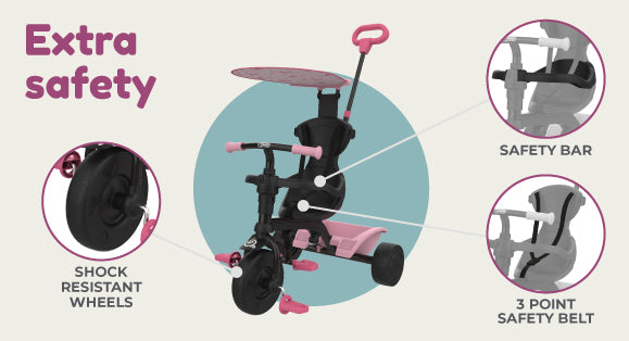 - 4-in-1 design grows with your child: stroller mode to independent trike