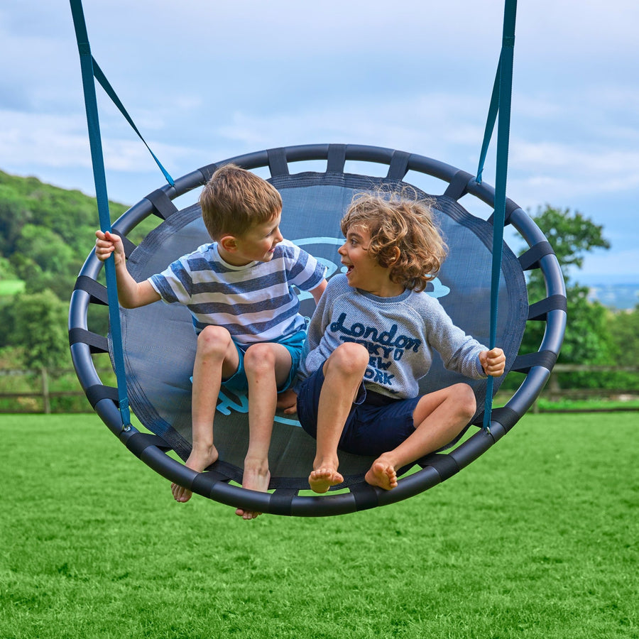 Rugged and rustic, this Double Round wood swing frame with Deck and Slide is sold complete with a fun Nest Swing