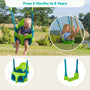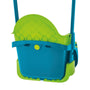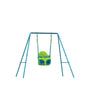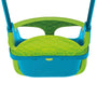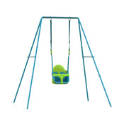The TP Toys Small to Tall 2 in 1 Metal Swing Set features a blue frame and a suspended green and blue Quadpod seat, ideal for toddlers. The swing set is displayed against a white background.