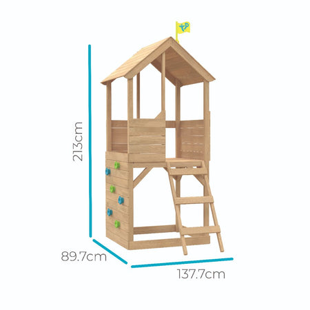 - The TP Treehouse Wooden Play Tower is jam-packed with great challenges for your active child to release some energy and create memories.
